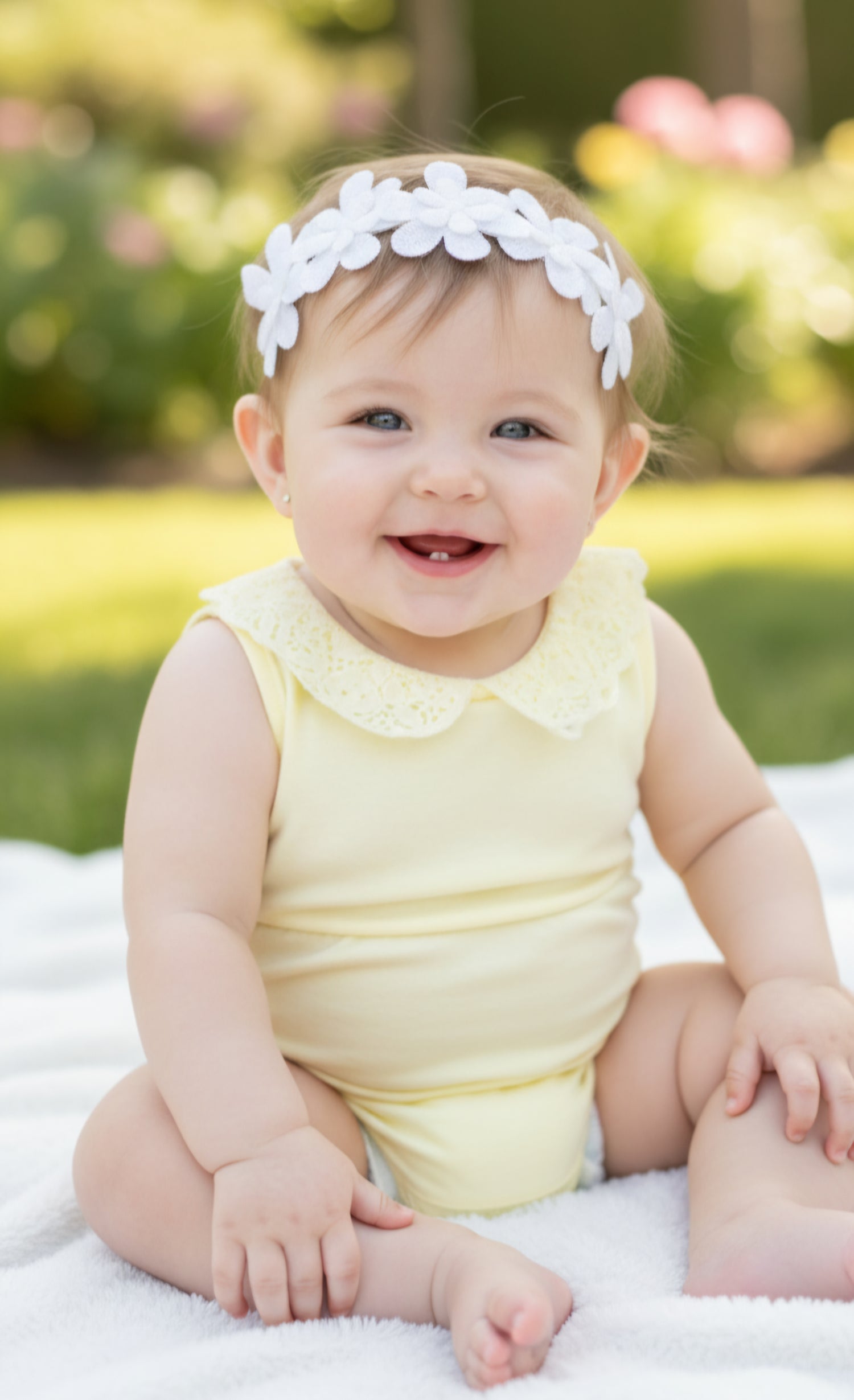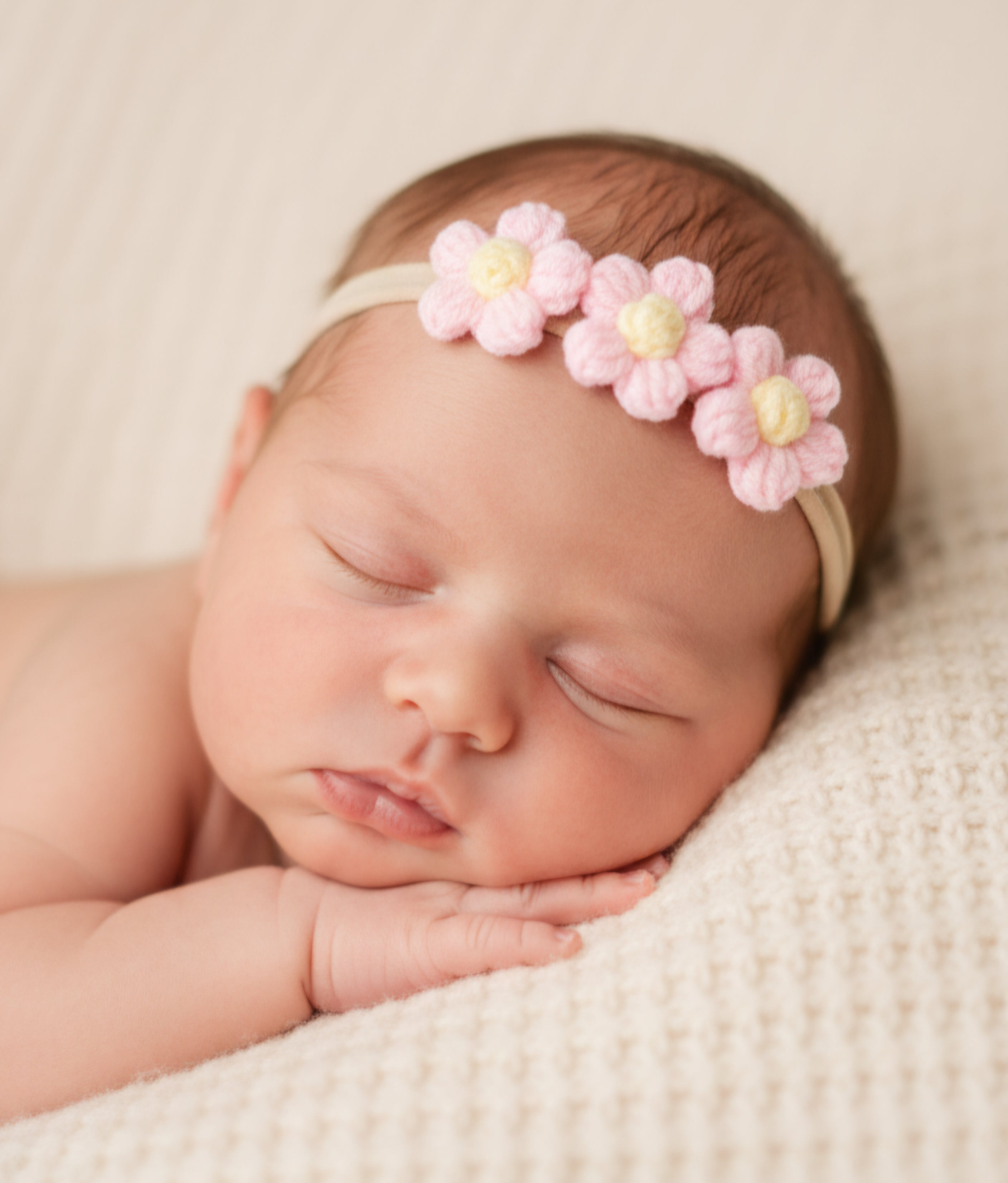 Nuestras bandas anchas y tiaras estan hechas con materiales premium, transpirables y elasticos, garantizando que tu bebe luzca hermosa sin molestias. Olvidate de los accesorios que aprietan o se caen.