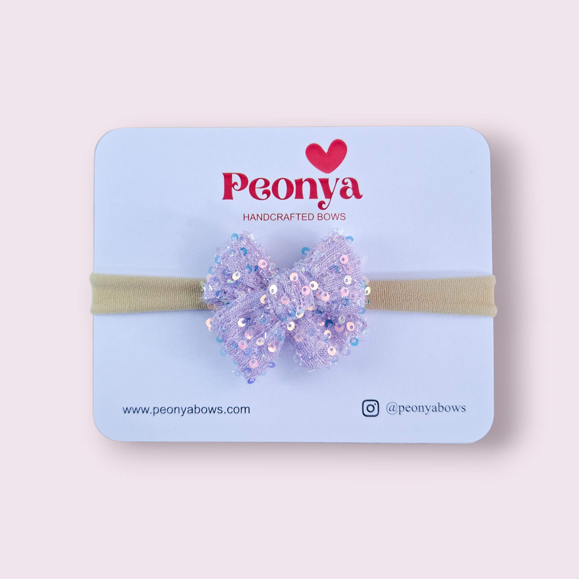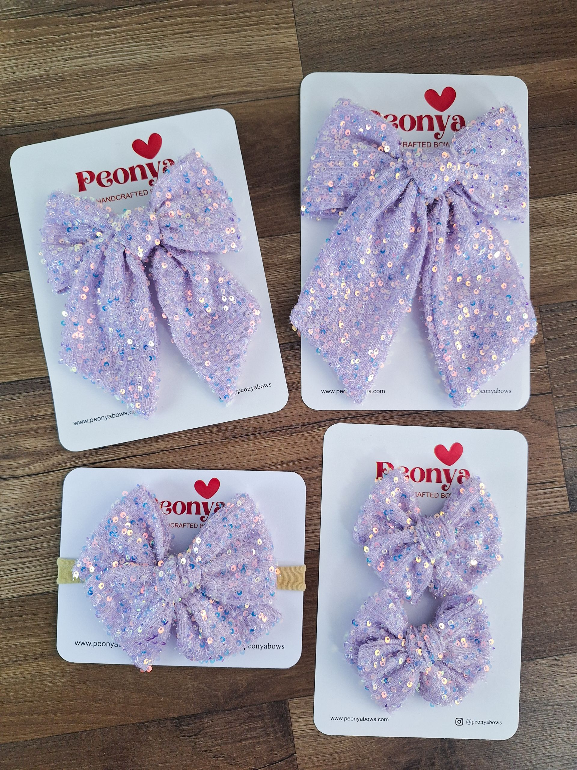 La tela con la que se realizaron estos moñitos es tan bonita! Tiene pequeñas lentejuelas color tornasol y brillan increible. Elige el tamaño de moño que mejor se adapte a tu pequeña.