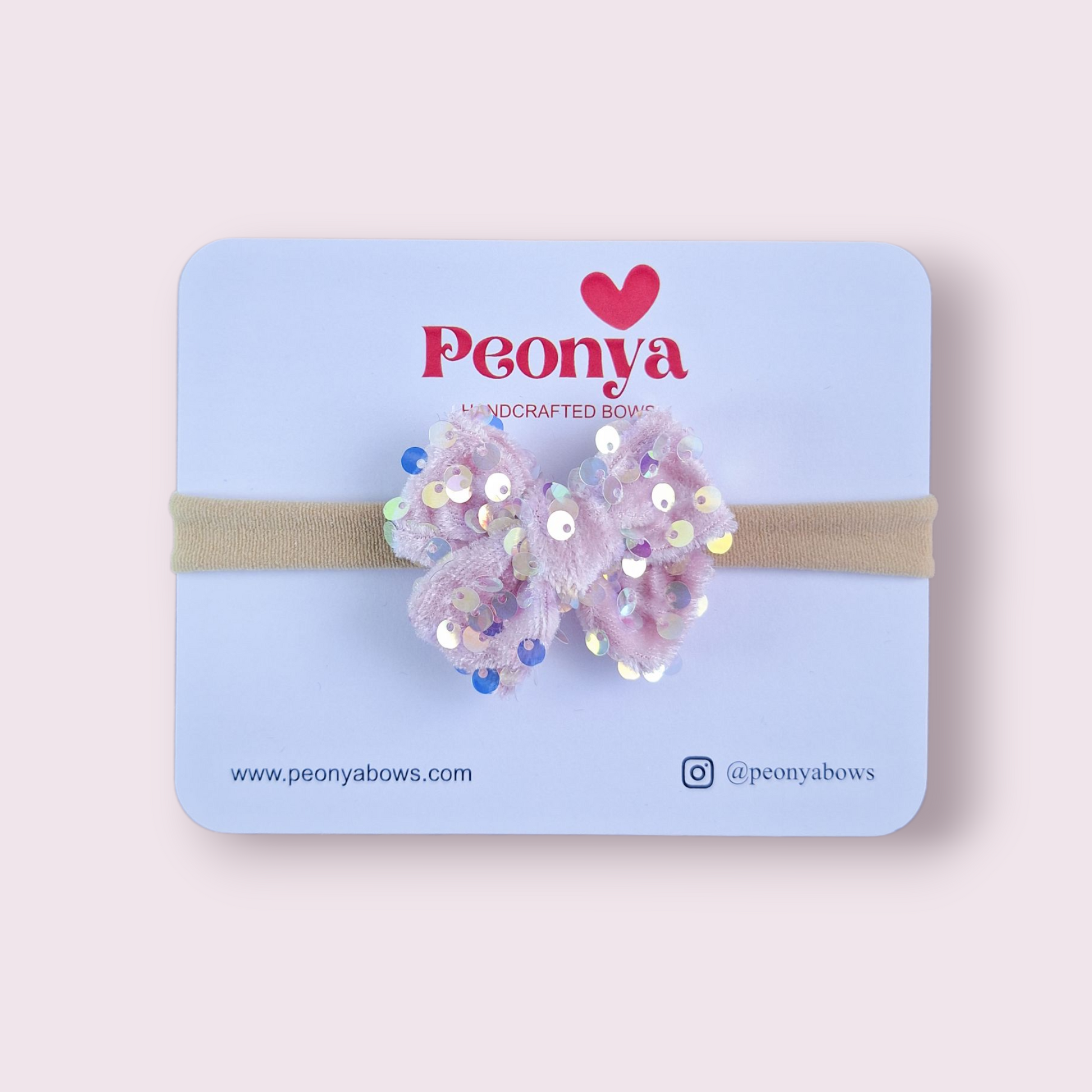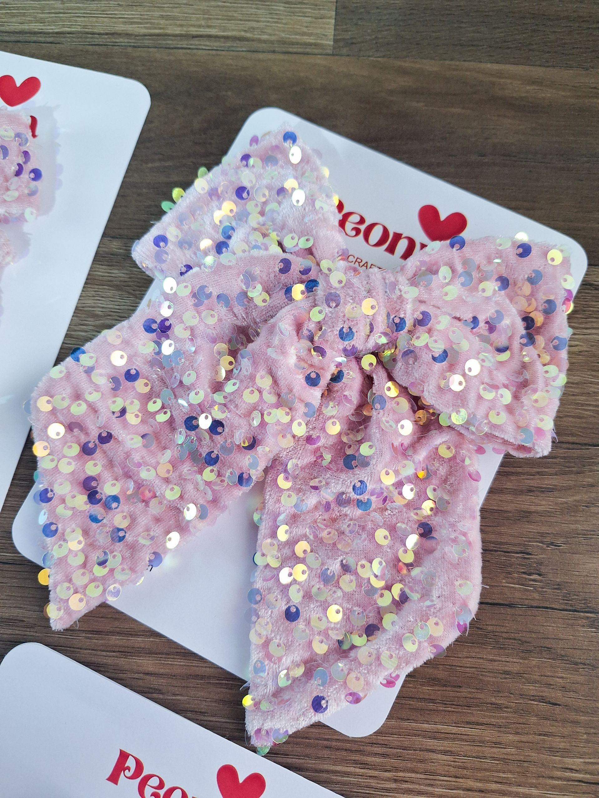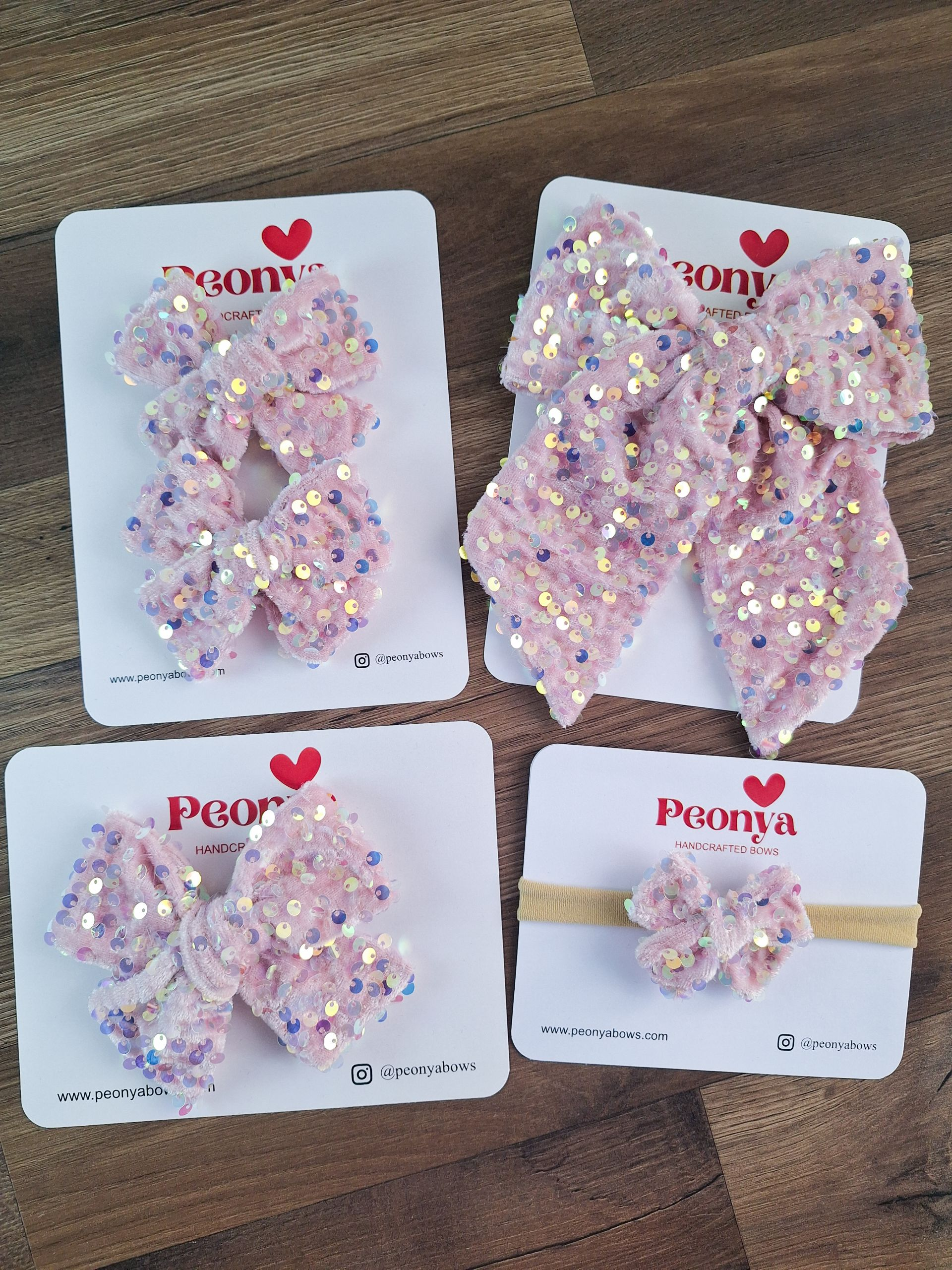 Tela de Terciopelo con lentejuelas bordadas, hecha unos hermosos moños para tu pequeña. ¡Un toque de dulzura para los sueños mas bonitos! Elige el tamaño que mejor se adapte a tu hija.