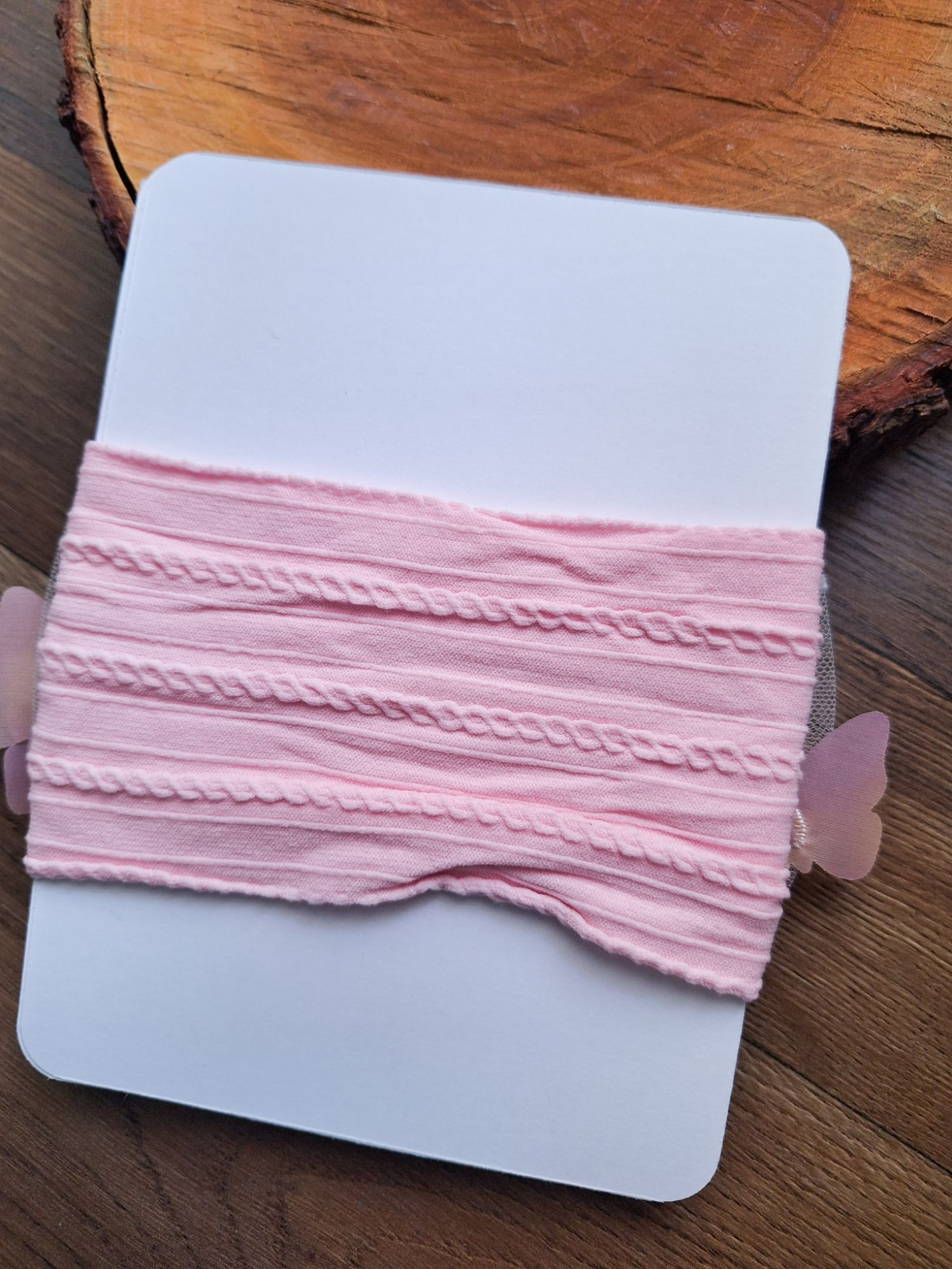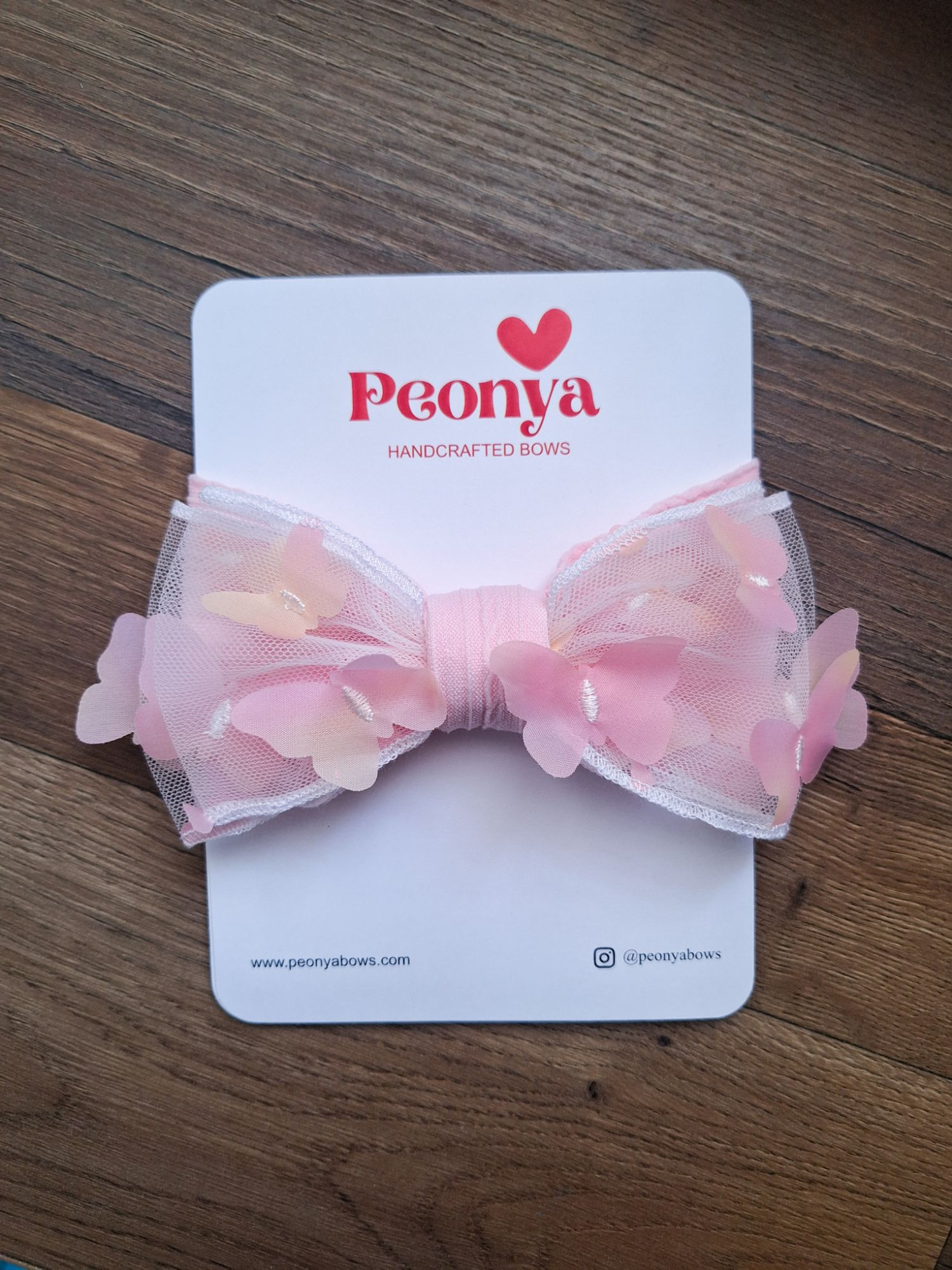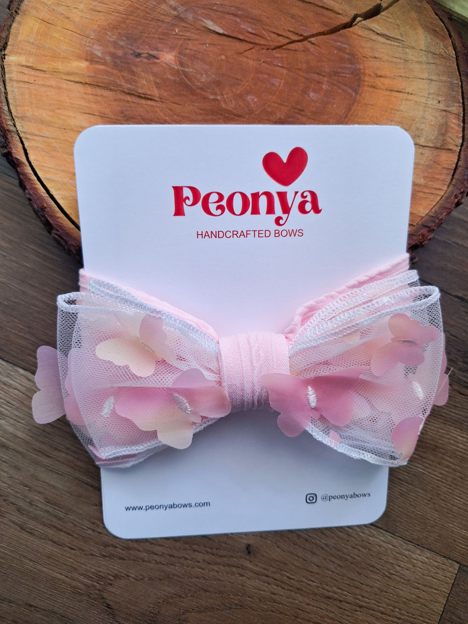 Moño doble de tul colocado sobre una tiara ancha de licra con textura. El moño mide aprox. 15 cm de ancho y tiene detalles de hermosas mariposas sobre el tul.